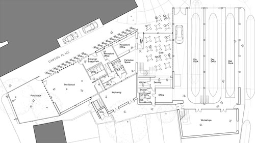 Community facilities groundfloor plan. Left to right: the pre-school, the heritage exhibition space, the community cafe and the boatyard.