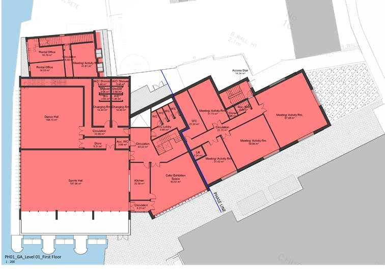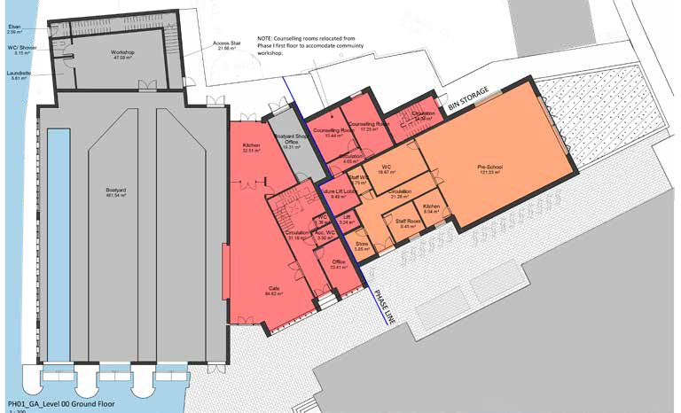 Phase 1 - incorporates a cafe and kitchen on the ground floor. This is a space designed to bring the community together and maximise views over the square and canal. The second key part of the ground floor is the boatyard and workshop. This will be managed by an experienced operator and provide space for the boating community to carry out maintenance and repair works within the two dry and one wet dock. The facility is aided by a large workshop, laundry and temporary accommodation for those who are working on their boats. This is accessed via a private staircase to the rear of the building and is designed for short stay guests only. The first floor of phase 1 houses a sports hall, sized to meet Sports England community hall standards, a dance hall, changing and shower facilities as well as a kitchenette opening on to the sports hall to cater for events in the space. This can then be opened up on to a large terrace overlooking the canal and square. Alongside these key spaces, there is a cafe and exhibition space, meeting room and two counseling rooms to be privately hired. The shell structure of Phase 1 will be developed and handed over to the operator (JWT) for fit-out.