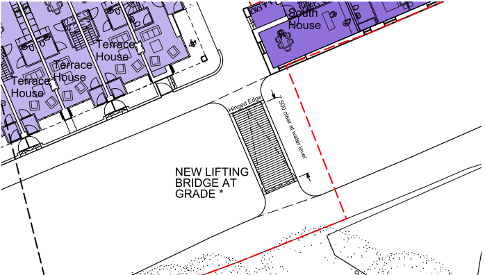Plan from previous planning application in 2014 The 2014 Planning Application incorporated a flat lifting bridge at the southern end of the site, linking with Little Clarendon Street. Regulations stipulate that for safety reasons a lifting bridge has to be located 40m away from a winding hole. Concerns were expressed that a bridge in this location would divert people away from the new Piazza, rendering it lifeless. A bridge linking into the Piazza is seen as an important contributor to the attraction of the Piazza and the community facilities The other issue that has to date not been possible to resolve, is finding a statutory organisation that is prepared to take on the responsibility for long term maintenance 5 Plan from previous planning application in 2014 it will embody. of a lifting bridge.